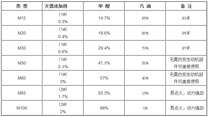 再將變性甲醇按照15%、20%或30%的比例加入國(guó)標(biāo)汽油內(nèi),攪拌均勻成為成品甲醇汽油,即M15、M20、M30成品;
